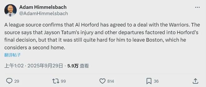 今年7月自由市场开启之后,勇士就将霍福德列为头号引援目标。由于第6个孩子即将出生,霍福德一度考虑退役。勇士承诺其“首发中锋”的位置,最终说服霍福德继续征战。塔图姆说:“本以为能跟霍福德打到他退役,可惜他却离开了。”