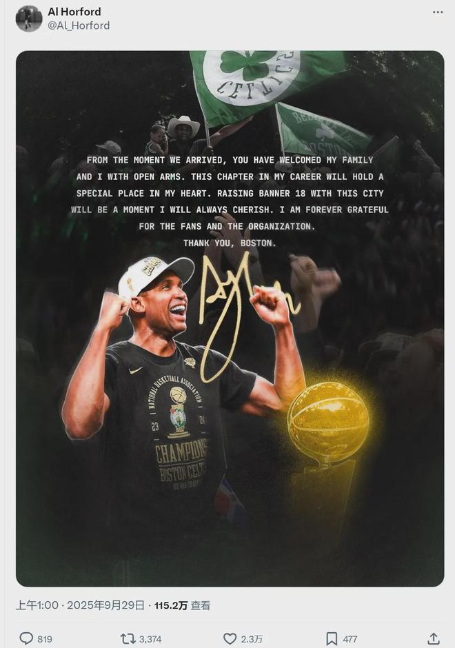 同样是今天凌晨,霍福德晒图告别凯尔特人:“从我来到这座城市的那一刻,波士顿的球迷像家人一样接纳了我。在我职业生涯中,这一篇章永远占据特殊位置。与这座城市一起夺得第18冠,是我永远珍视的时刻。谢谢你,波士顿。”