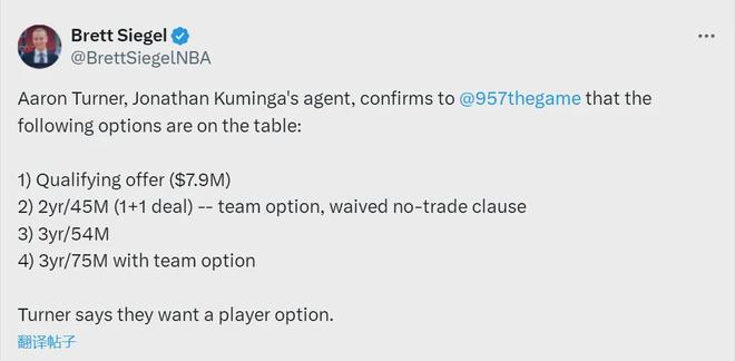 勇士拒绝了库明加先签后换的交易方案,库明加的经纪人阿隆-特纳透露,目前库明加还有4种选择:1、接受1年790万美元资质报价;2、接受2年4500万,同时放弃交易否决权;3、接受3年5400万;4、接受3年7500万+球队选项。