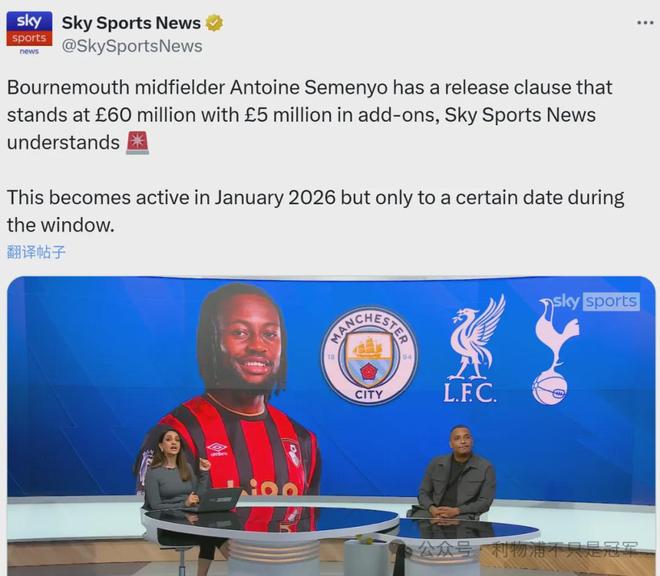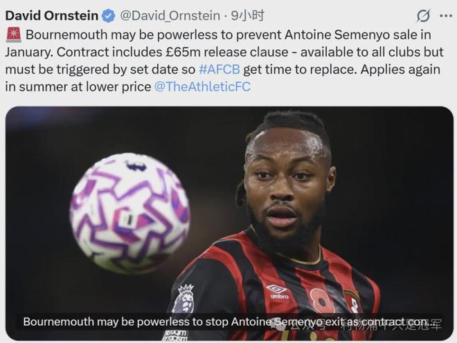 BBC则表示,此项条款需要在明年1月冬窗的前两周内激活,以便让伯恩茅斯有时间去买塞梅尼奥的替代者。